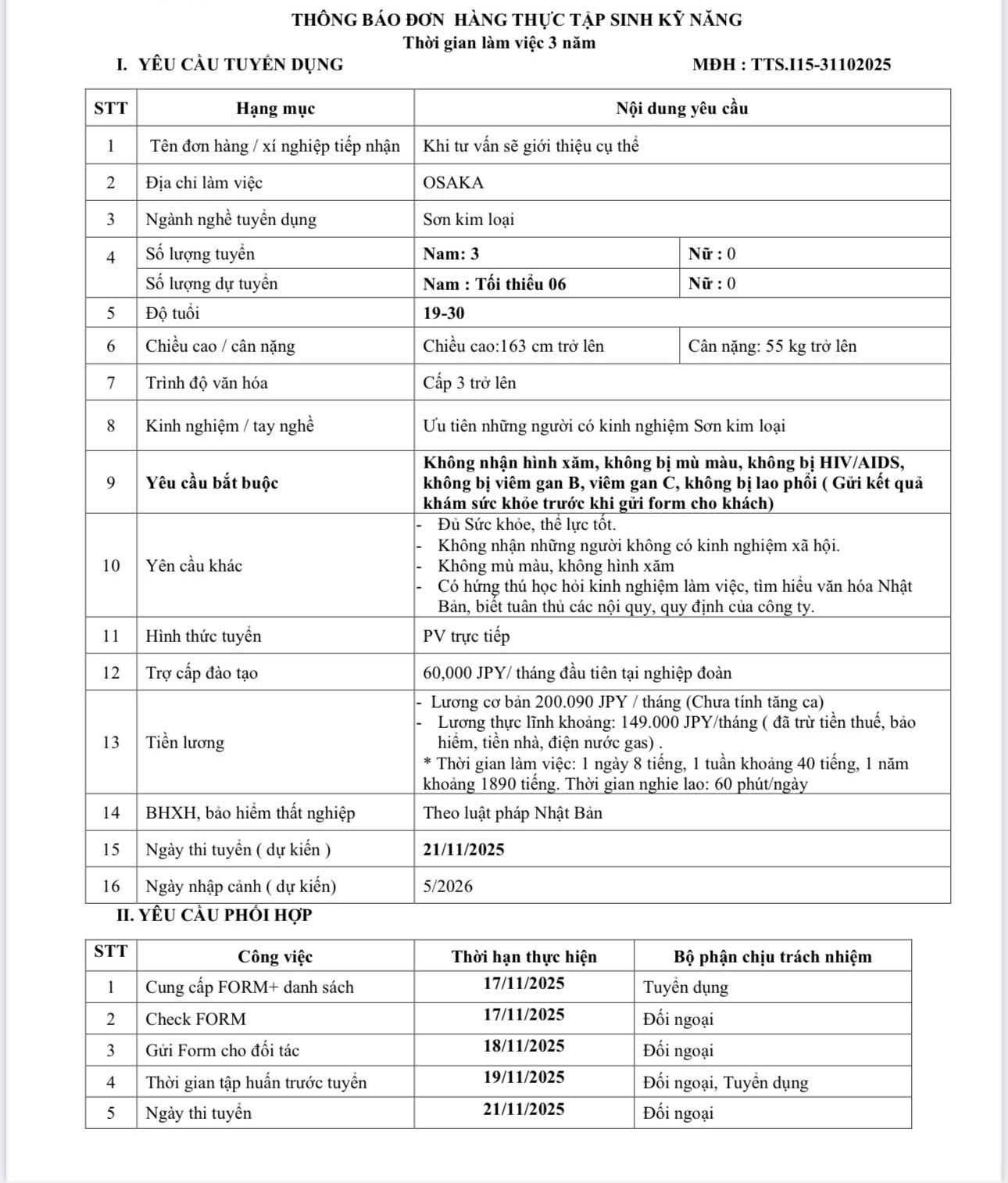 ĐƠN HÀNG, Đơn hàng thực tập sinh, Tin tức ĐƠN HÀNG TRUYỀN THỐNG SƠN KIM LOẠI OSAKA – NHẬT BẢN Thông tin đơn hàng Số lượng: 3 Giới tính: Nam Độ tuổi: 19 – 30 tuổi Lương: 200.090 JPY/tháng Thi tuyển: 21/11/2025 Công việc: Sơn kim loại Nơi làm việc: Nhật Bản Thời hạn hợp đồng: 3 năm PHỎNG VẤN ĐƠN HÀNG KIỂM TRA LINH KIỆN OKAYAMA – NHẬT BẢN